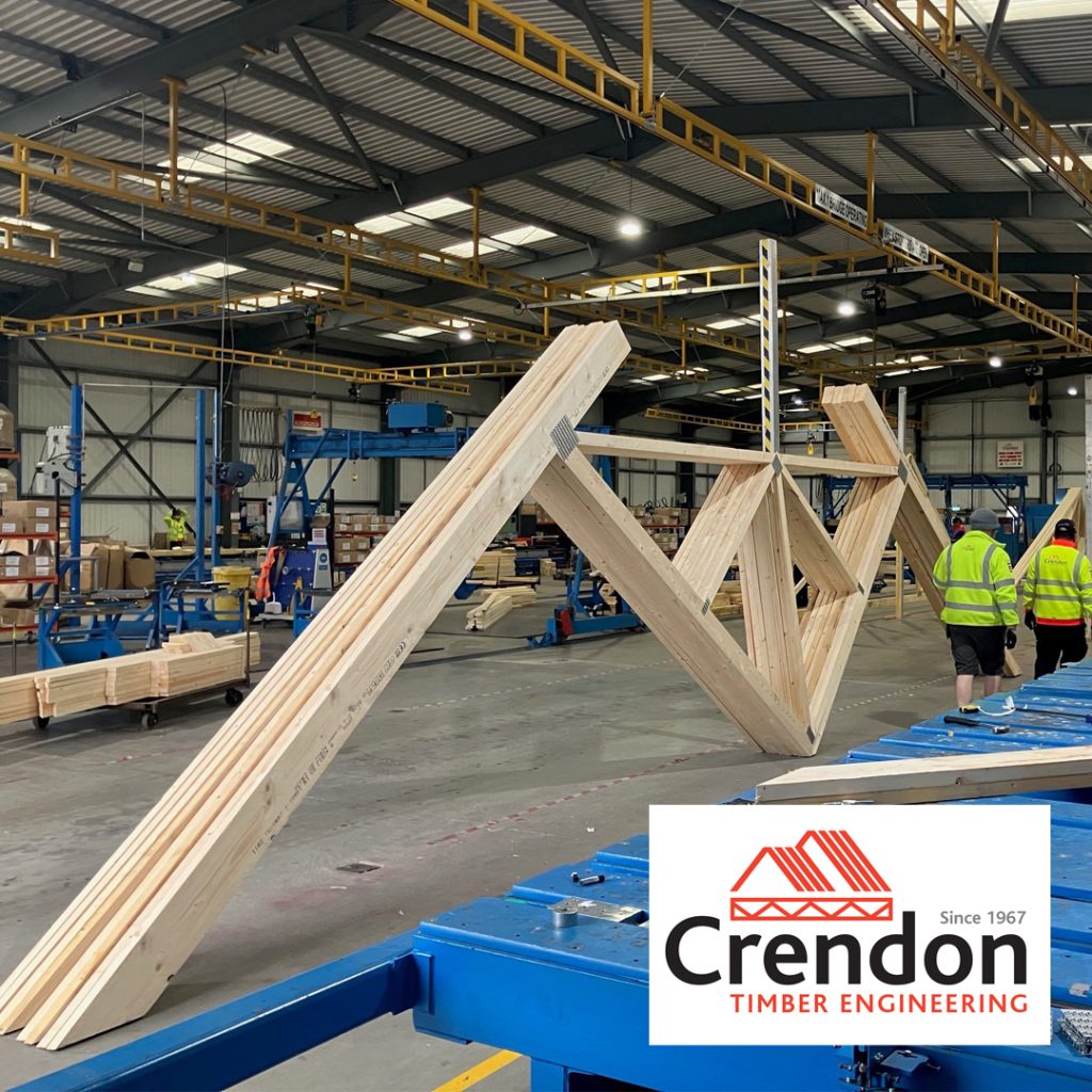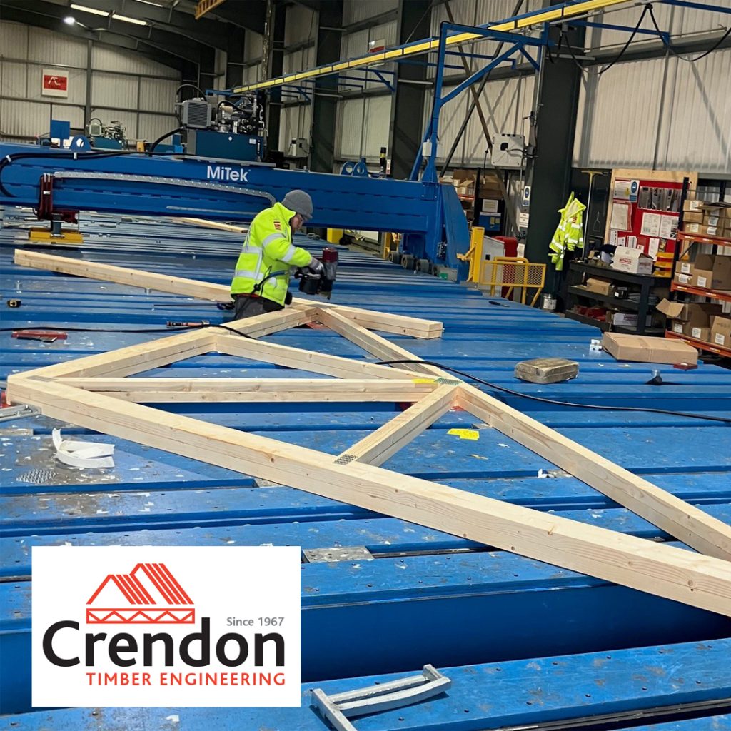 12m span Top Hat Trusses being manufactured this week. This is to create a double vaulted ceiling above two separate rooms for an extension and garage in Great Barton.