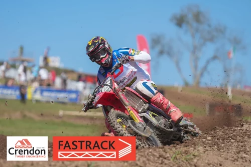 The Crendon FASTRACK Honda set the fastest time in qualifying at the old-school Landrake circuit then wasted no time in getting to the front of the opening moto. Gating in third place, he quickly got past John Adamson and set his sights on race leader and fellow Honda CRF450R rider Josh Gilbert. Local ace Gilbert held Mewse off until the third lap when the lead changed and Mewse pulled away to win by 10 seconds.