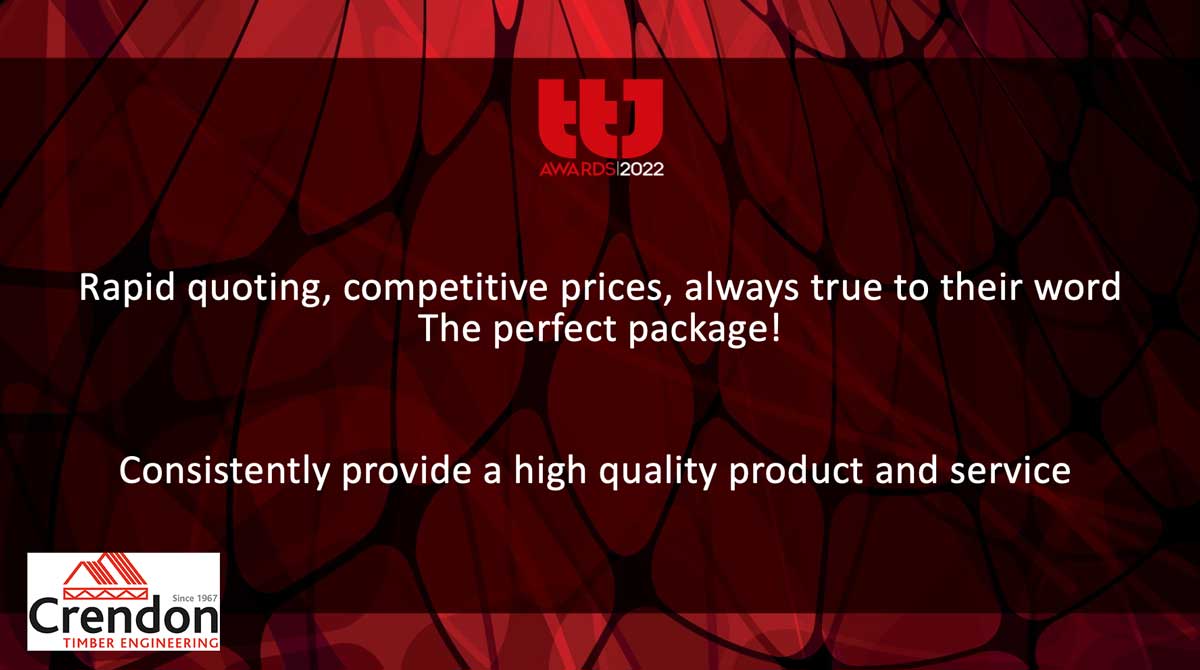 We are delighted to have been announced as winners of the TTJ 2022 Structural Timber Supplier of The Year Award, this now makes it a hat-trick with winning the Award previously in 2019 and 2021.