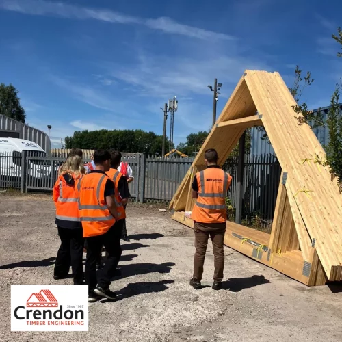 A group of people standing for a photo in front of a Crendon Timber Engineering Roof Truss